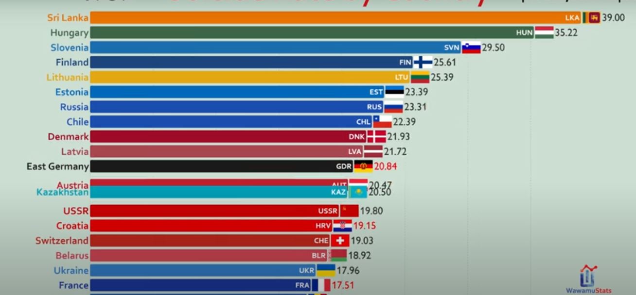 2016 දී නිකුත්කරන ලද සංඛ්යා ලේඛනවලට අනුව ශ්රී ලංකාවට ලොව සියදිවි නසාගැනීම් ලැයිස්තුවේ 31වෙනි ස්ථානය හිමිවී ඇත. 1989 – 1993, 1997-1999 යන වසරවල දී මෙම ලැයිස්තුවේ ශ්රි ලංකාව ප්රථම ස්ථානයේ පසු වූ අතර, 2000න් පසුව සෝවියට් සමූහාණ්ඩුවේ රටවල සංඛ්යා ලේඛන වෙන් වෙන්ව වාර්තා කිරීම හේතුවෙන් ශ්රී ලංකාව එම ලැයිස්තුවේ පහළට වැටිනි.